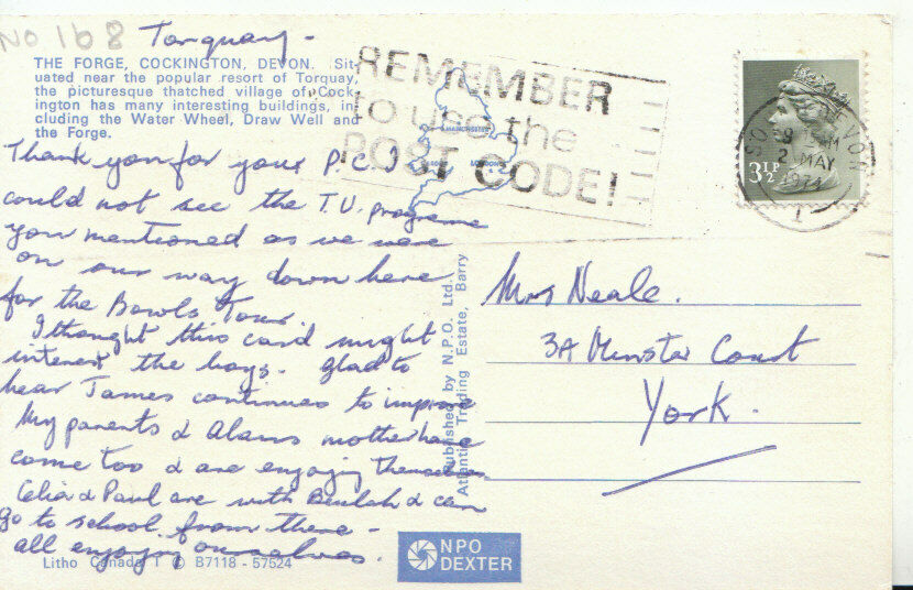 Mo's Postcards Postcard Description: Devon Postcard -The Forge - Cockington Genealogy Information: Used - 1974Defects: Slight rubbing to bottom right hand corner Postage & Payment: For U.K residents the quoted P & P fee is for any number of postcards purchased at one time. Happy to quote for non UK residents. For multiple purchases please wait for an invoice