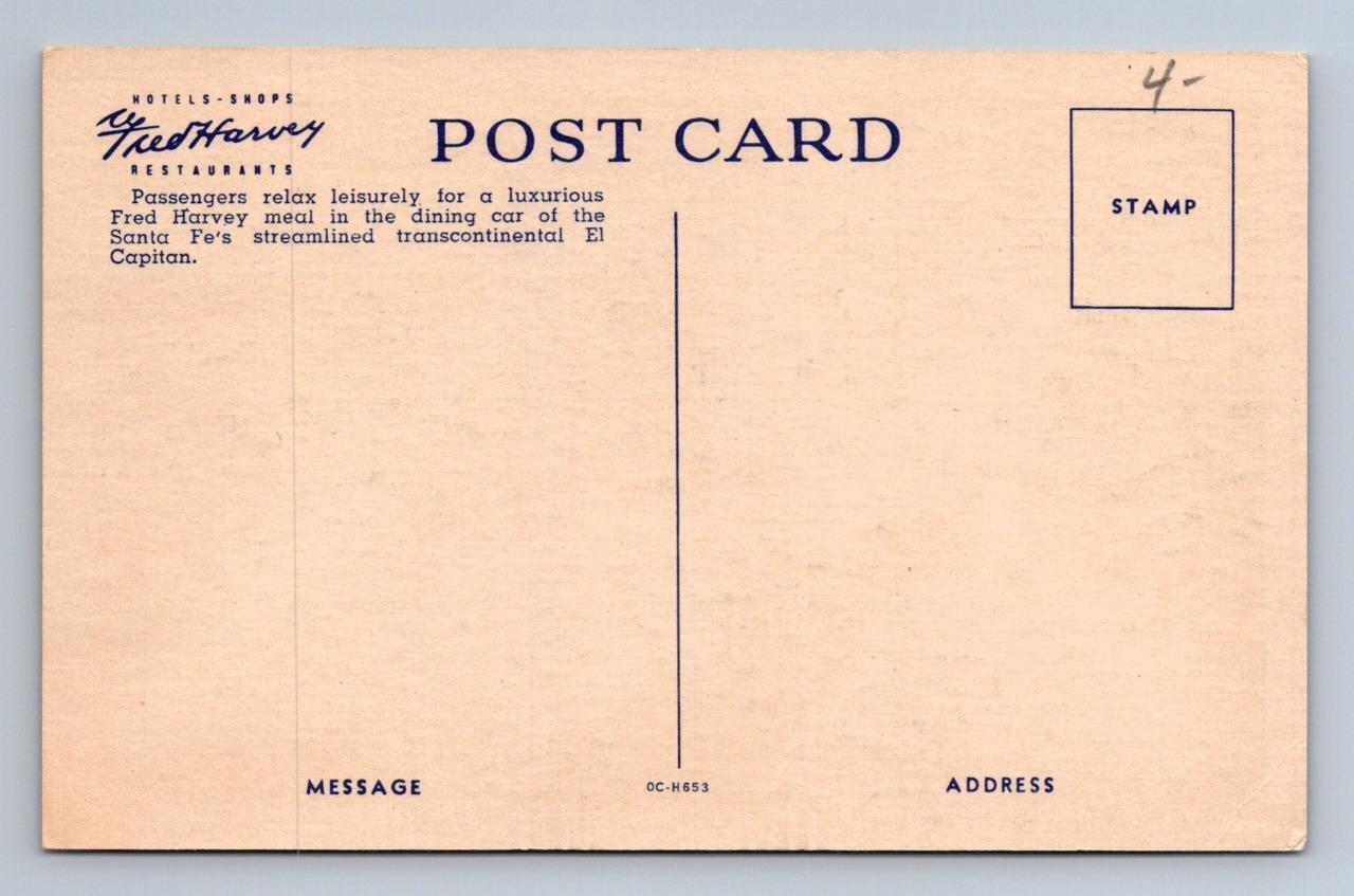 DINING CAR SANTA FE EL CAPTAIN TRAIN FRED HARVEY POSTCARD (1940s)