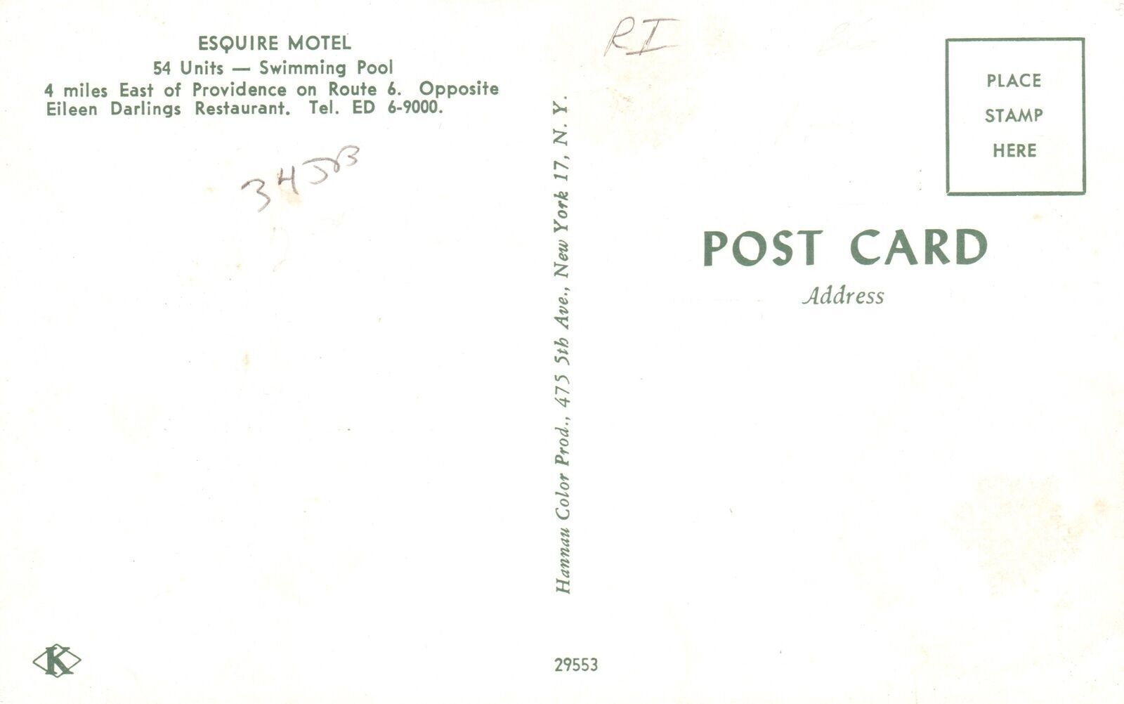 Dining Restaurant & Pool Esquire Motel Providence Rhode Island TV Postcard
