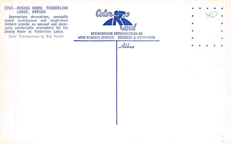 Dining Room, Timberline Lodge Mt Hood, Oregon OR Postcard - Unused Grade: 1 Size: R - Regular Size Postcard - approximately 3 1/2 inch x 5 1/2 inch (9 CM x 14 CM) Grading Scale: Grade 1 = Perfect corners Grade ... Read More
