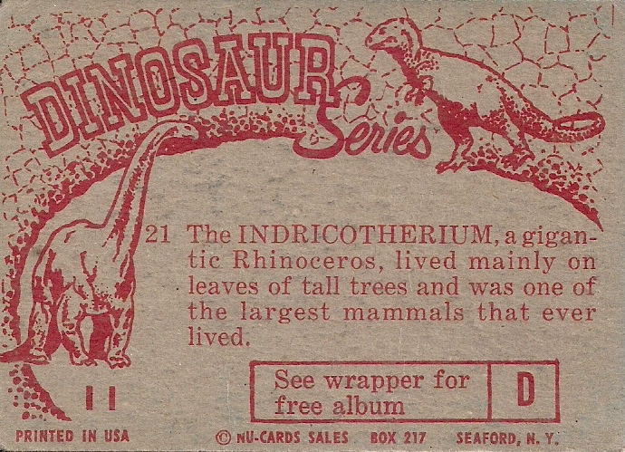 Standard size card (like a baseball card, NOT a postcard) from Nu-Card Dinosaur series, number 21,Indricotherium. Medium good condition, please see both scans. Three cards ship for the price of one.