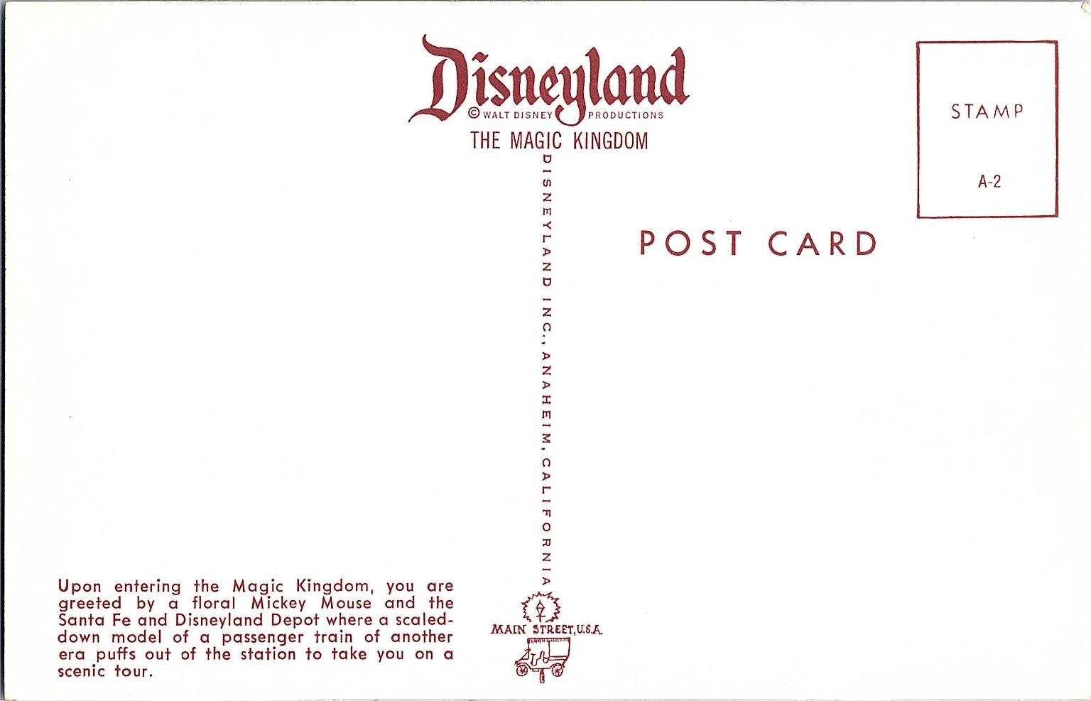Condition: Pre-owned. With mild edgewear. This vibrant vintage postcard showcases the iconic Disneyland Train Station in Anaheim, California, featuring the beautifully manicured floral Mickey Mouse garden at the e ... Read More