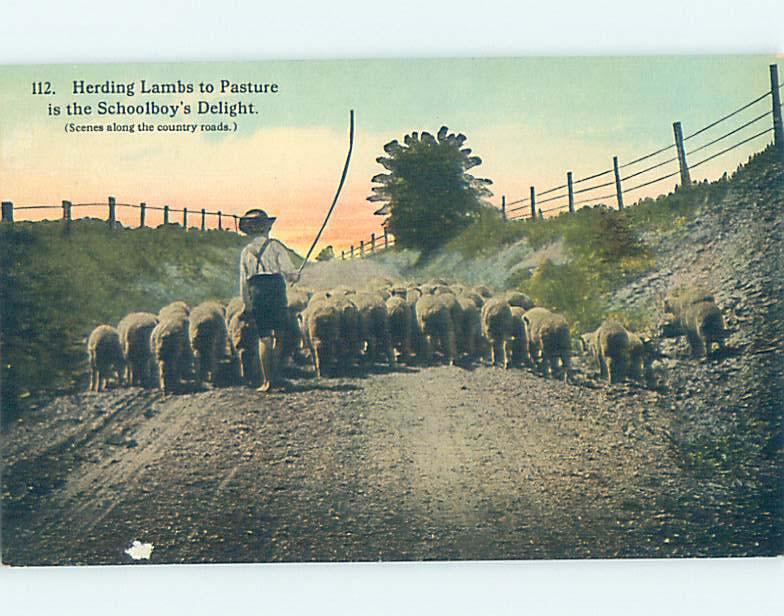 Divided-back BOY HERDING LAMBS DOWN THE ROAD Postmarked Springfield MA AD8143