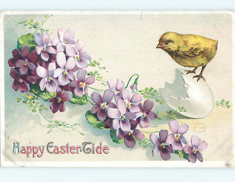 Divided-Back Easter CHICK STANDS ON EGG SHELL BY FLOWERS o6600