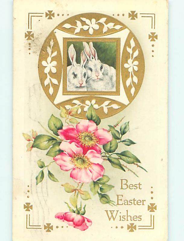 Divided-Back easter TWO WHITE BUNNY RABBITS & PINK FLOWER r3305
