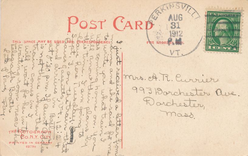 Postmarked at Perkinsville VT on August 31, 1912.