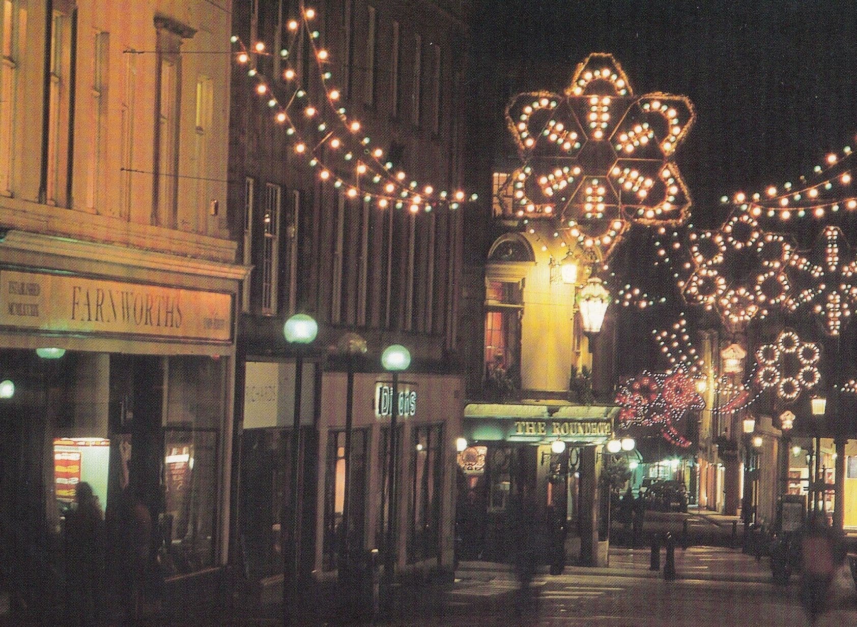 851x A fascinating circa 25 years ago origin postcard showing Dixons at night also Farnworths and the Roundhouse pub unused and mint