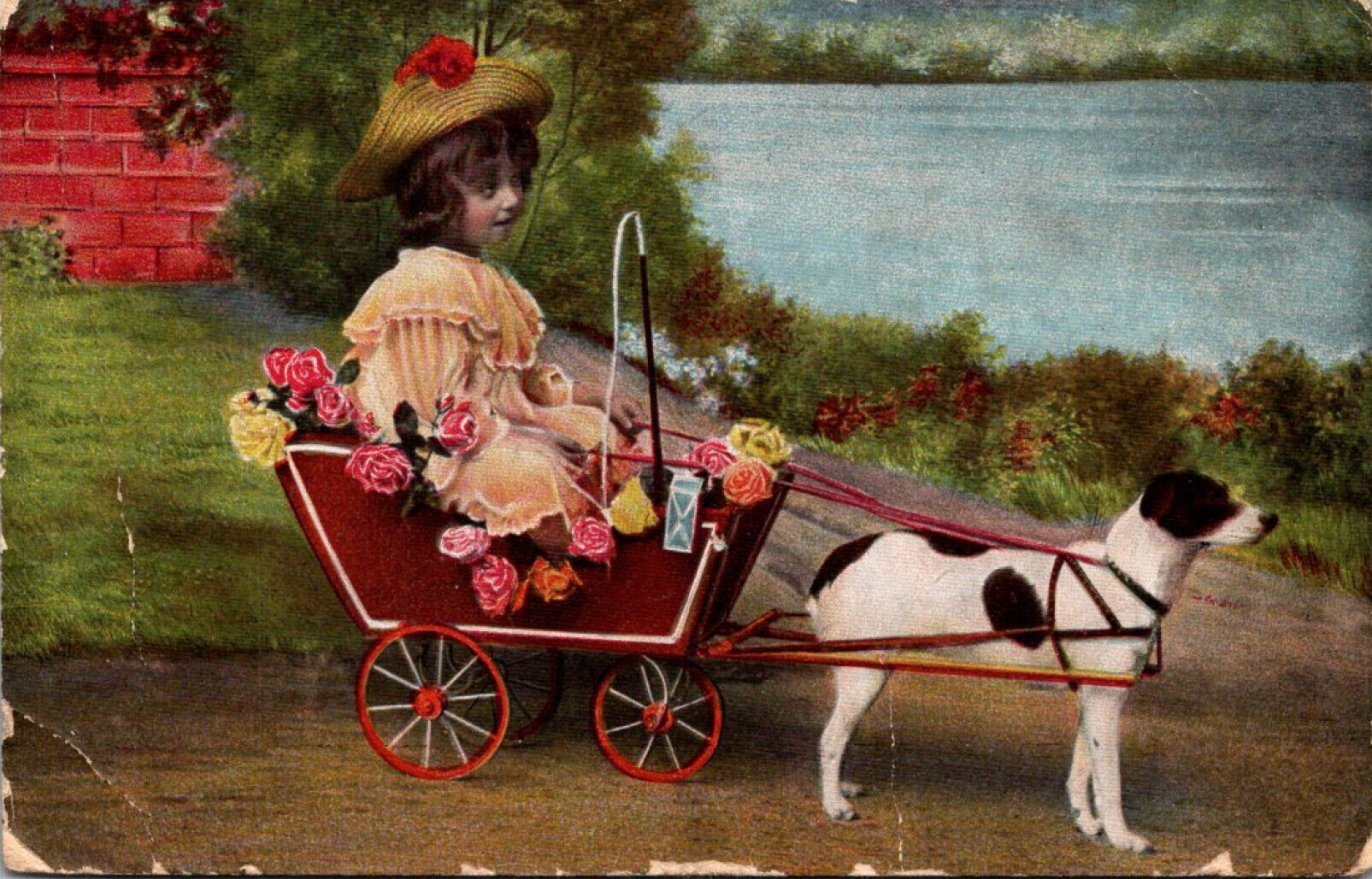 Dog Pulling Young Girl In Wagon 1907