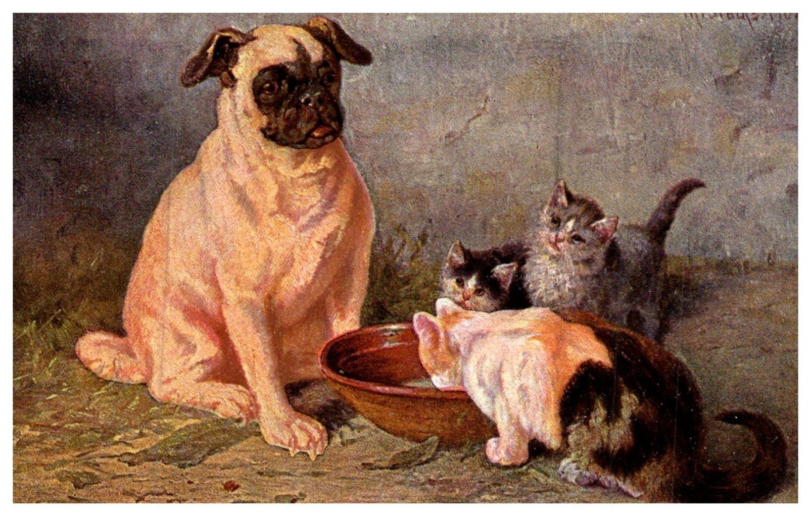 Dog , Watching cats drink milk