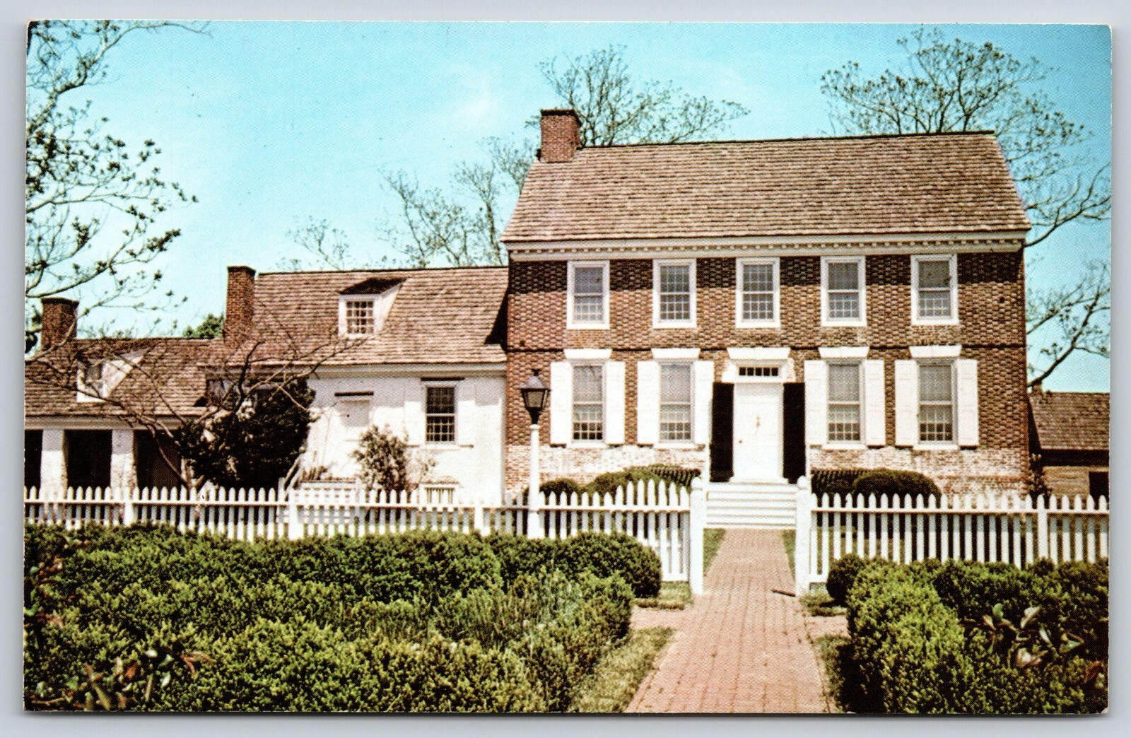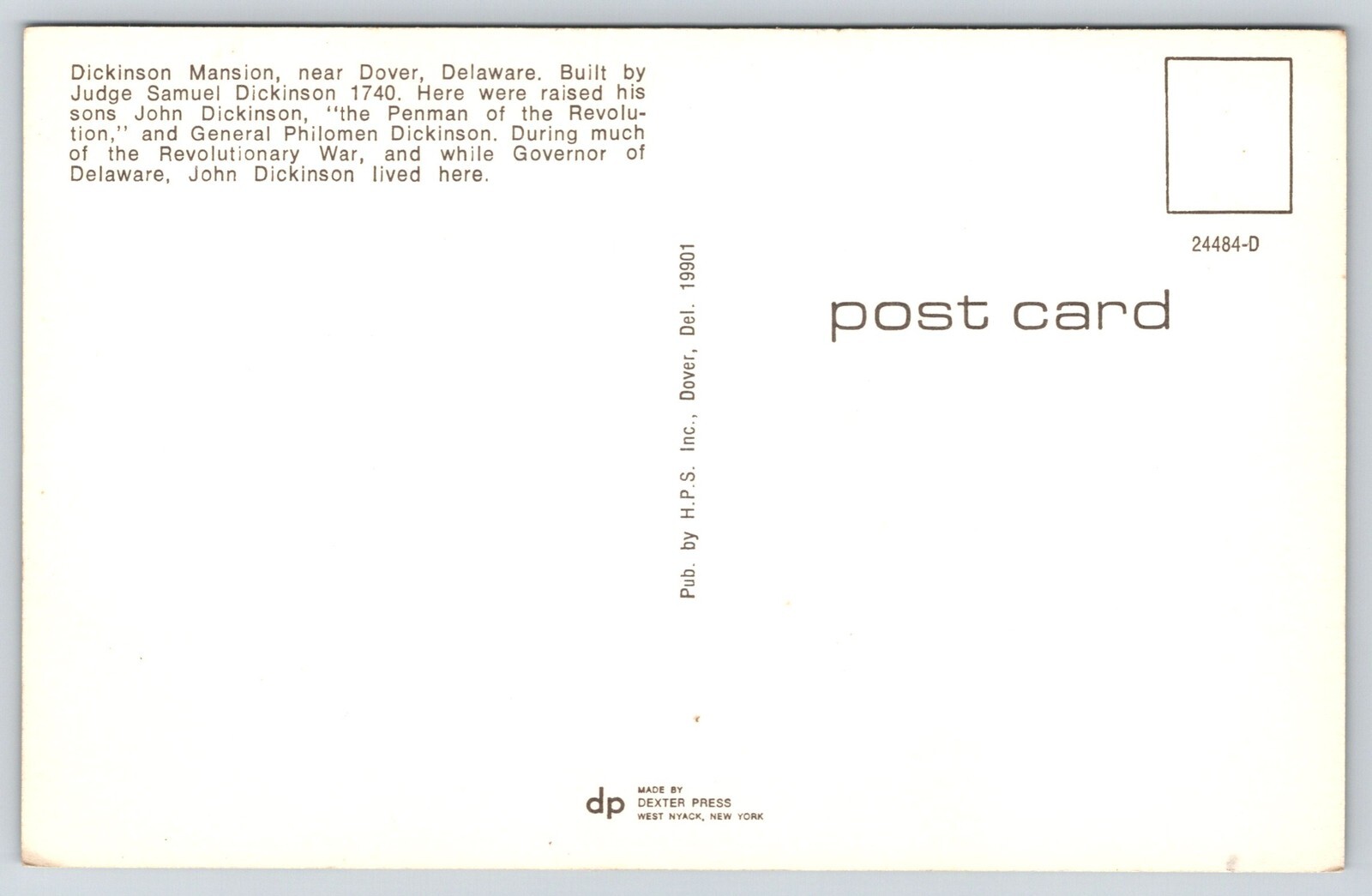 Dover Delaware~Dickinson Mansion Front View~Lamp~Fence~Hedges~1950s Postcard