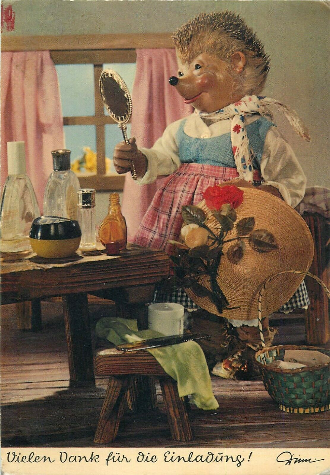 Dressed hedgehog puppet mirror Germany fantasy greetings postcard