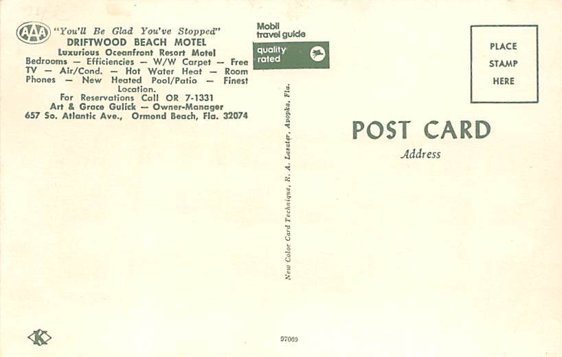 Driftwood Beach Motel Oceanfront Resort Ormond Beach FL Postcard - Unused Grade: 1 Size: R - Regular size: Approx 3 1/2 X 5 1/2 inch (9 cm X 14 cm) Grading Scale: Grade 1 = Perfect corners Grade 2 = Very Minim ... Read More
