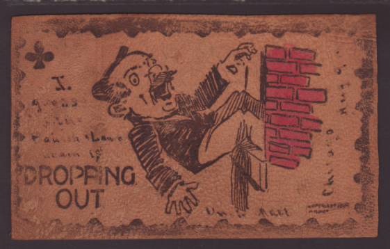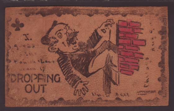 Dropping Out,Man,Wall,Leather  Unused Postcard undivided back. EX Grading Terms MINT - Perfect in every way, regardless of age. Rarely seen, may not exist. NM - Near Mint, you have to look closely to see ... Read More