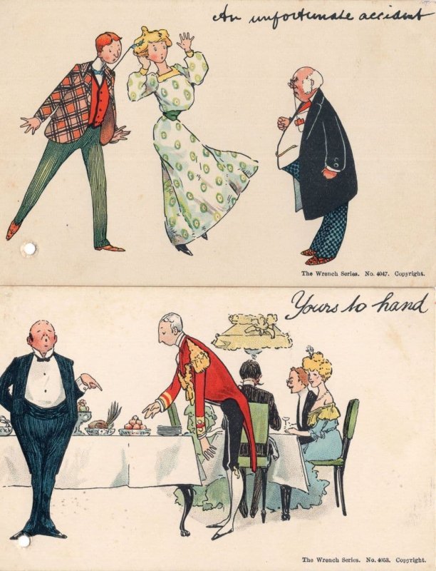Drunk Lady Restaurant Waiter 2x Old Comic Wrench Series Postcard s