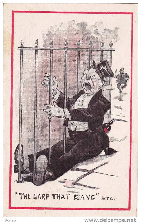 Drunk man plays fence like a harp , 00-10s :: Postcard , 3.5 by 5.5" , Litho , EX