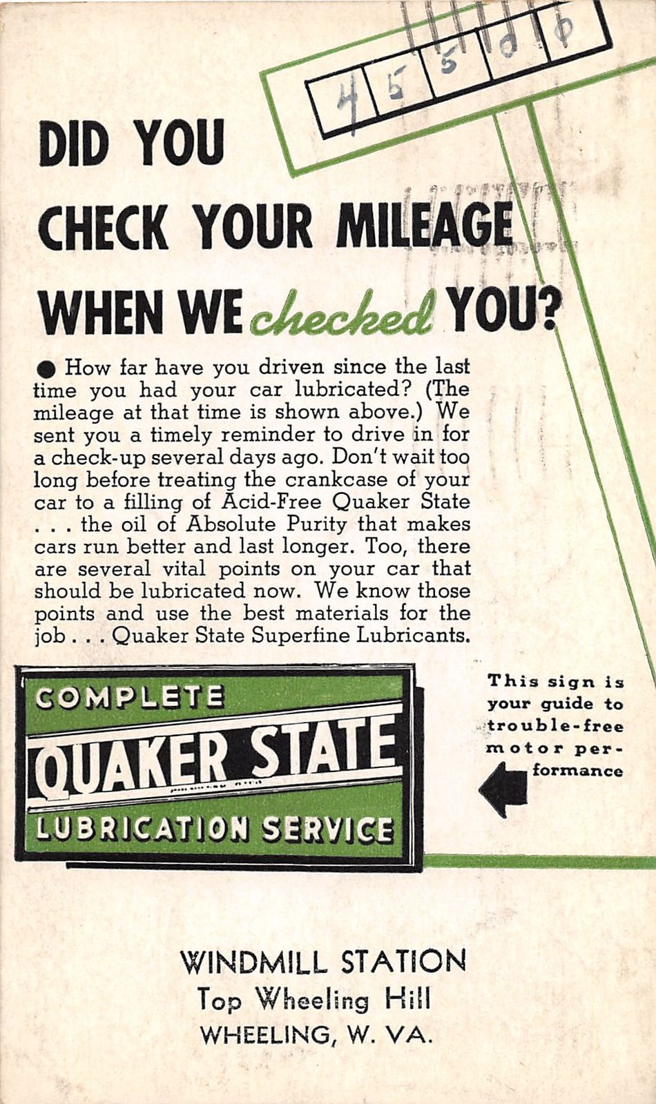 E83/ Wheeling West Virginia Postcard 1940 Advertisement Windmill Gas Station