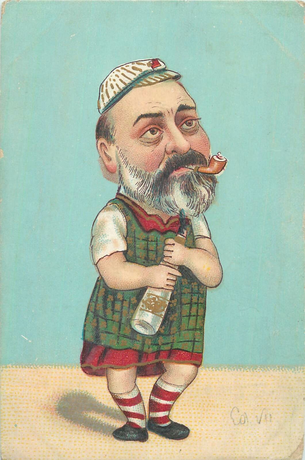 Early comic caricature bearded man drinking & pipe smoking infantilized