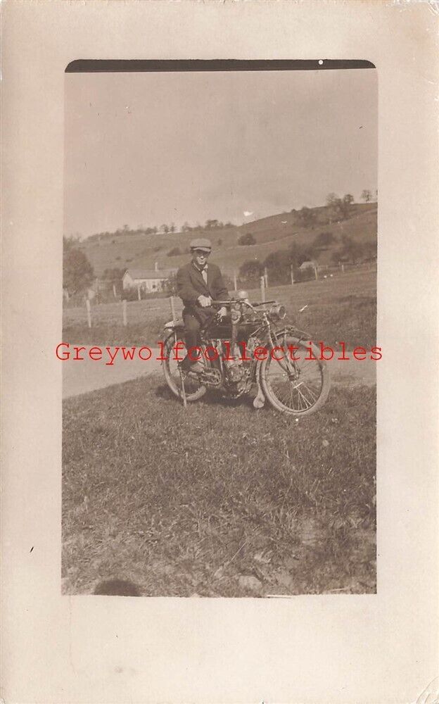 Real Photo Postcard Early Motorcycle, Man Siting on it Postmark: None, AZO Stamp Box 1904-18 Image: Nice and clean Corners: Light wear Faults/Other: