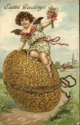 Easter Angel Flower Egg Gilt Embossed Greeting c1910 Post...