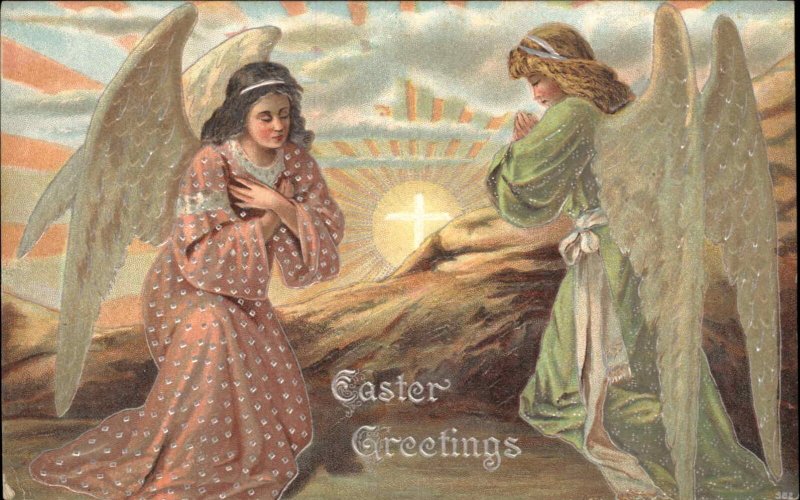 Easter Angels Pray at Sunset Christian Cross c1910 Vintage Postcard
