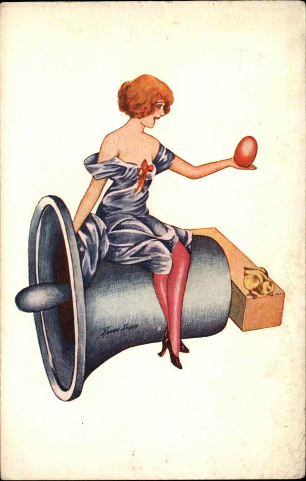 Easter - Beautiful Woman w/ Egg Sits on Bell c1910 Postcard
