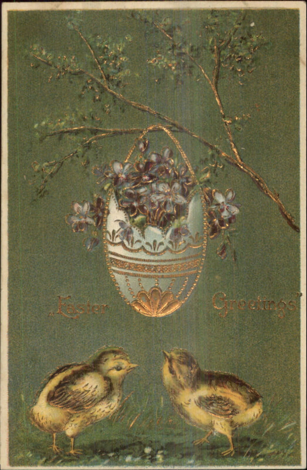 Easter - Chicks Egg Basket on Branch Gilt Embossed c1910 Postcard