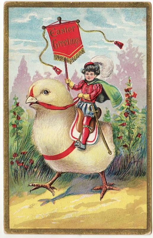 EASTER CHILD in UNIFORM rides LARGE CHICK postcard