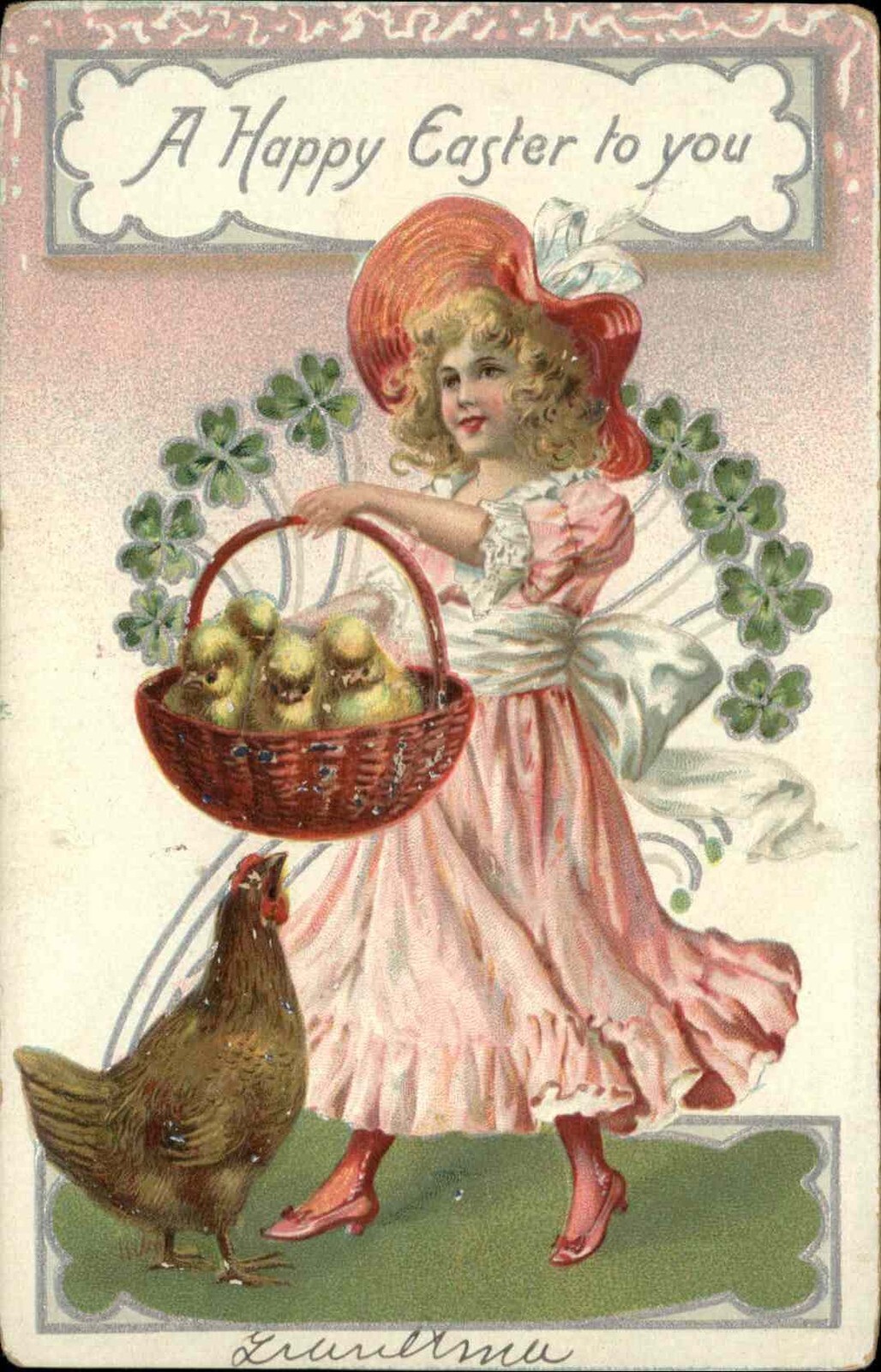 Easter Children Chick Hen Basket Clover Embossed Vintage Postcard