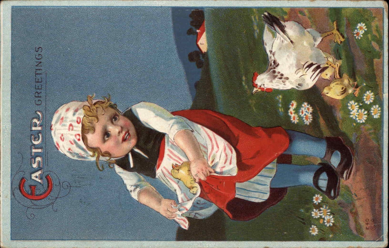 Easter Children Chick Hen Bonnet Embossed Vintage Postcard