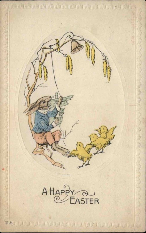 Easter Fantasy Dressed Rabbit Ringing Bell For Chicks c1910 Embossed Postcard