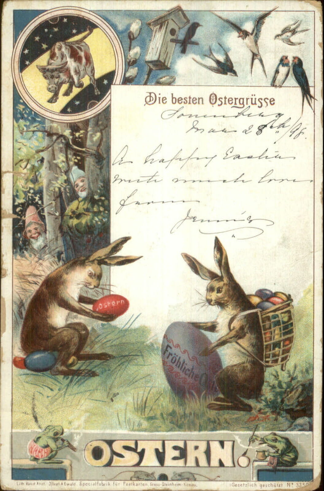 Easter Fantasy Rabbits w/ Eggs Frog Border Gnomes 1898 German Postcard