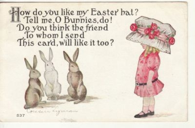 EASTER GIRL in LARGE BONNET / RABBITS 1912 postcard