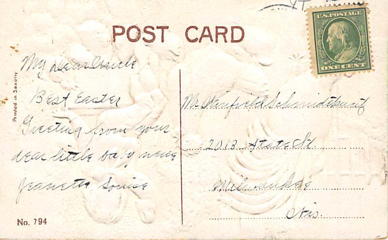Easter Postcard Greeting Postcard, Grade: 2 Size: Regular Size Postcard - approximately 3 1/2 inch x 5 1/2 inch (9 CM x 14 CM) Grading Scale: Grade 1 = Perfect corners Grade 2 = Very Minimal corner wear, no cre ... Read More