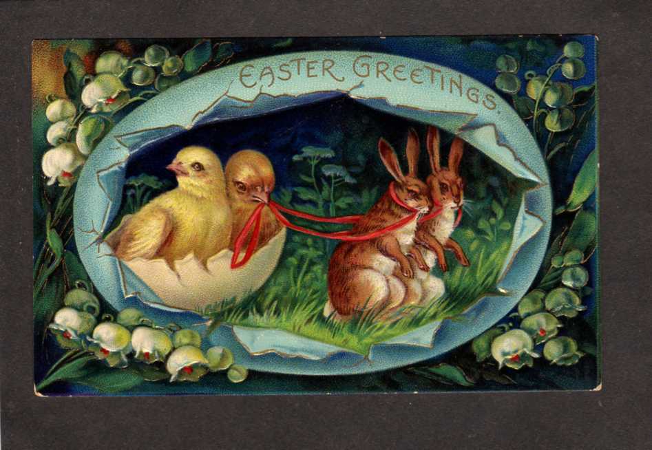 Easter Greetings Postcard Chicks pulled by Rabbits Egg Postcard Embossed