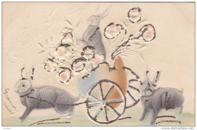 EASTER; Greetings, Rabbit-drawn egg shell wagon, Flowers, Glitter Detail, 00-10s :: Postcard , 3.5 by 5.5 , Litho, VG+, WOB