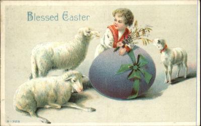 EASTER Little Boy w Lambs & Giant Egg c1910 Postcard