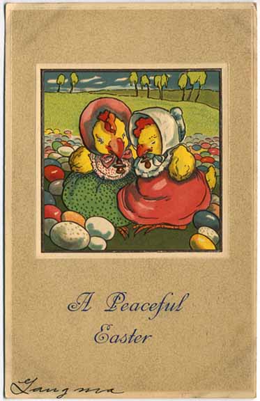 Easter PC Dressed Chickens with Colored Eggs in Field