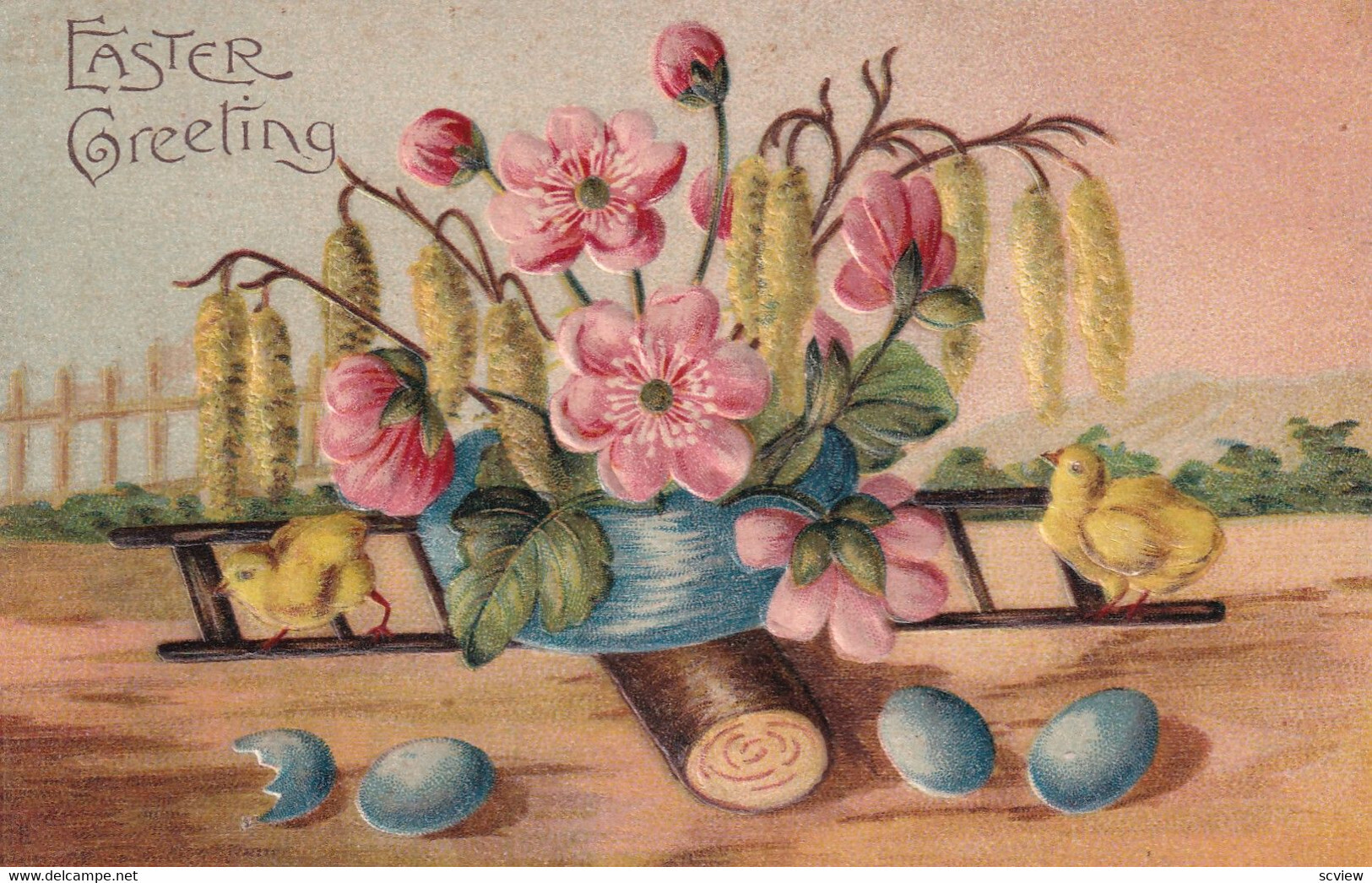 EASTER, PU-1908; Greeting, Potted pink flower on Teeter Totter, Chicks, Blue eggs, Embossed :: Postcard, 3.5" by 5.5", Litho