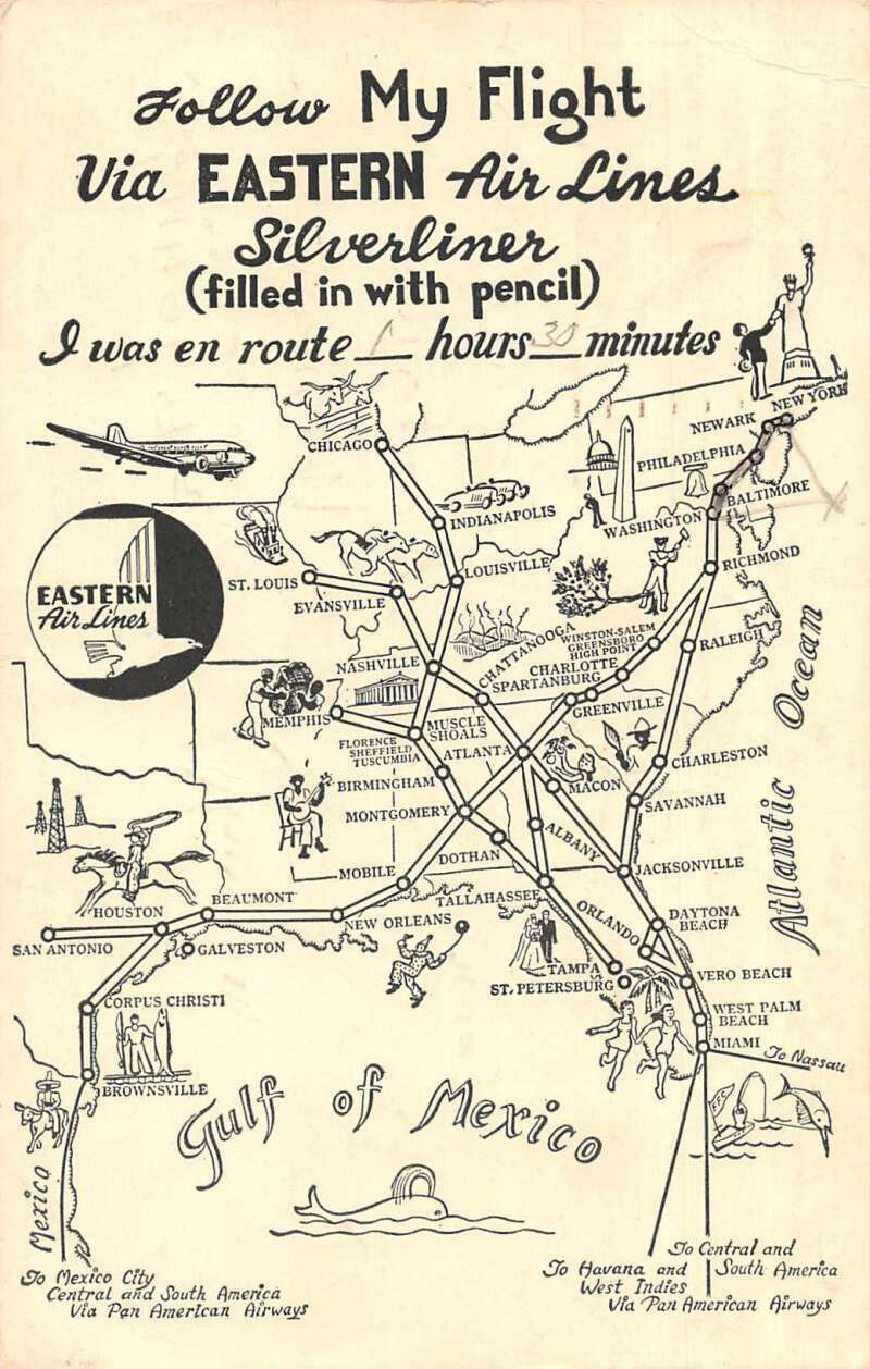 Eastern air lines silverliner airplane map advertising postcard aa12315