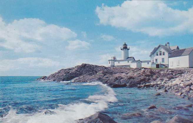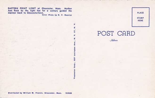 Eastern Point Light House. Gloucester, Massachusetts . Mother Ann Rock. Standard sized chrome card. Excellent condition.