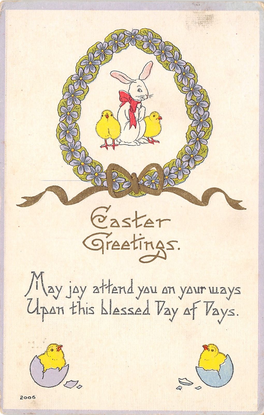 Easter~Silly White Rabbit in Egg Shaped Violet Wreath~Chicks~Embossed~1919 PC
