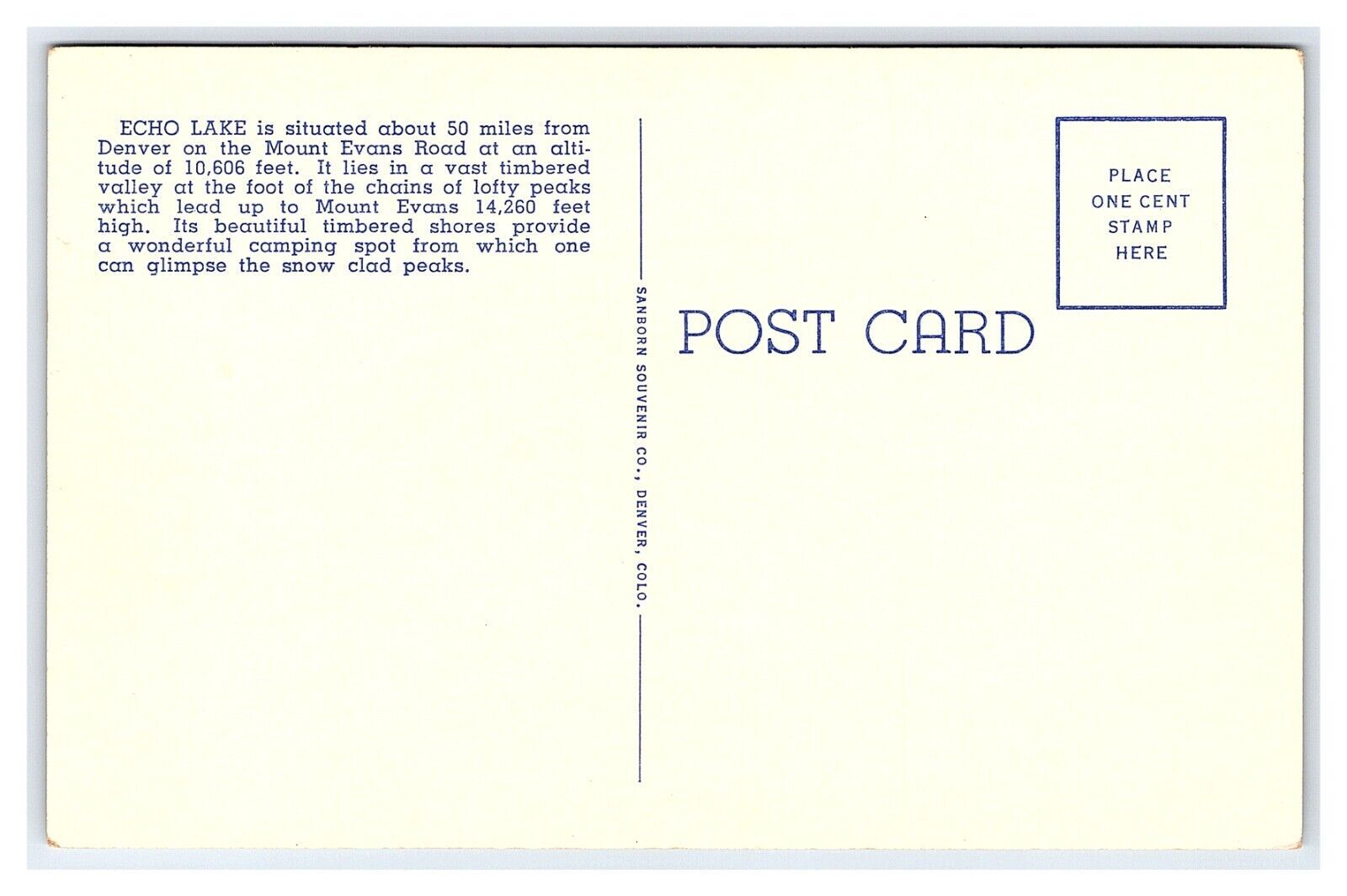 Echo Lake Looking Toward Mt. EvansDenver Mountain Parks Colorado Vintage Standard View PostcardPostcard Enclosed in Clear SleevePlaced Between 2 Pieces of CardboardShipped USPS First Class MailNon Machinable-Marked Do Not BendCombined Shipping AvailableReasonable Offers Always ConsideredWATCH This Item For Possible DiscountPlease Look At My Hip Store Listings For More Sale Items