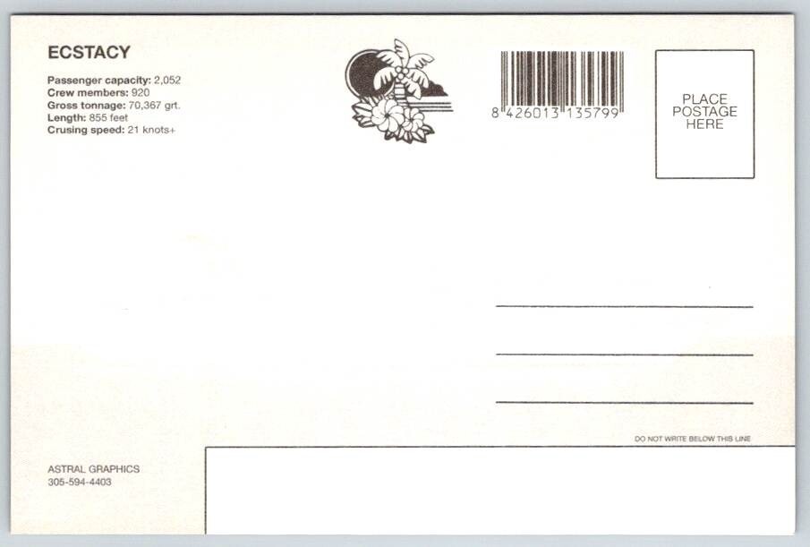 Ecstacy Carnival Cruise Line Postcard