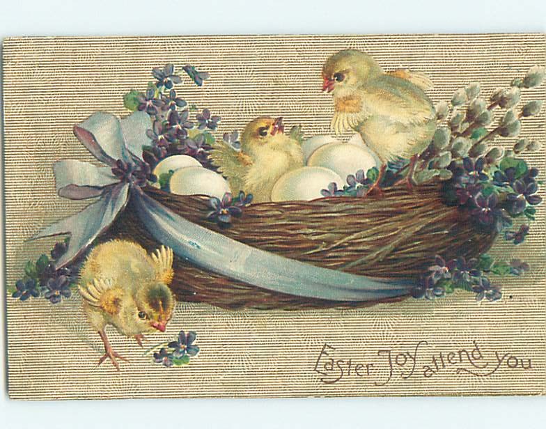 Edge Tear c1910 easter CHICKS AND EGGS IN WICKER BASKET WITH PUSSYWILLOW HL0752