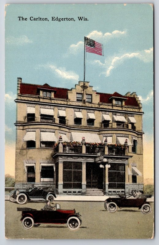 Edgerton WI~The Carlton Hotel~Stepped Parapets~F Kemp Architect~c1910 Autos~PC