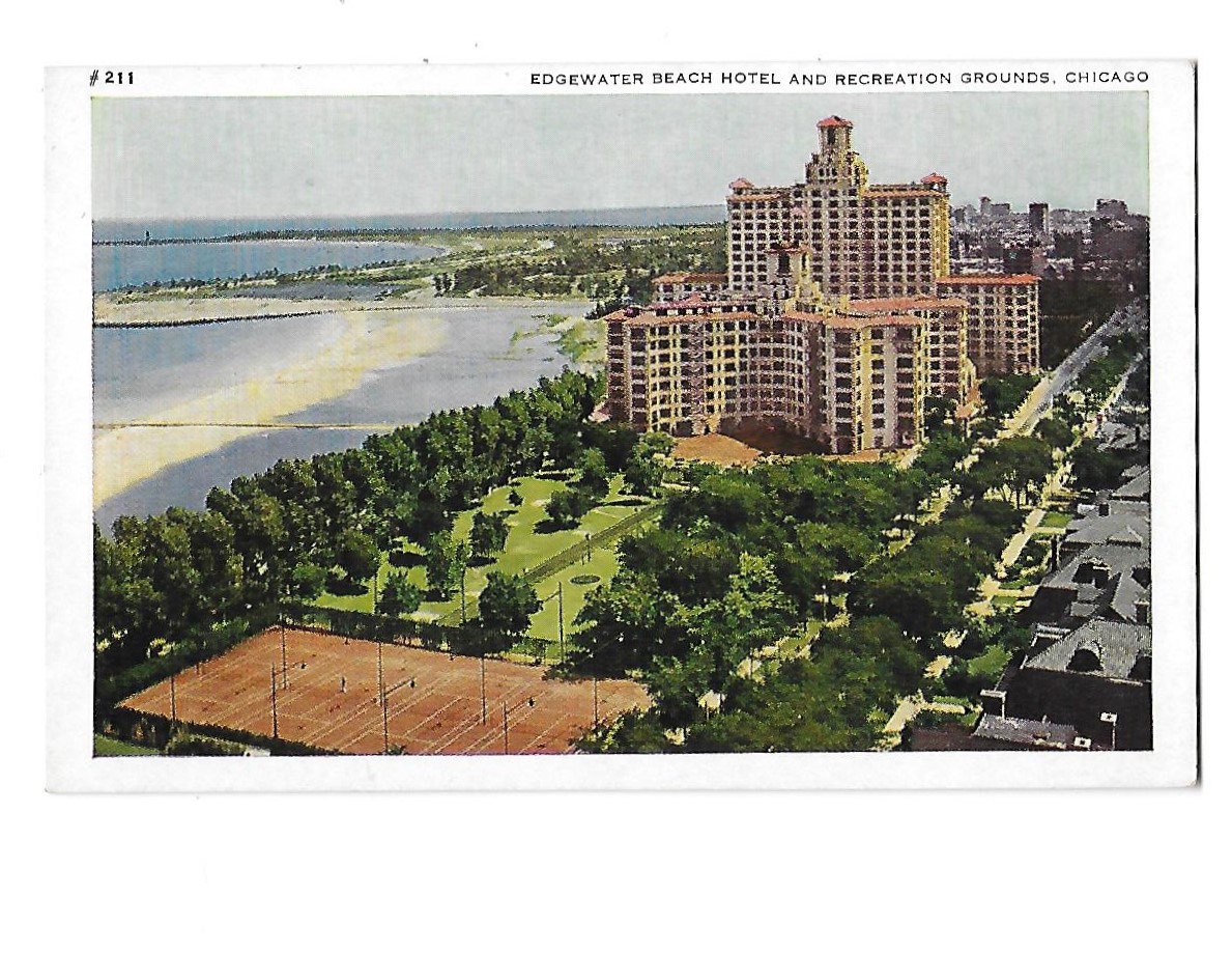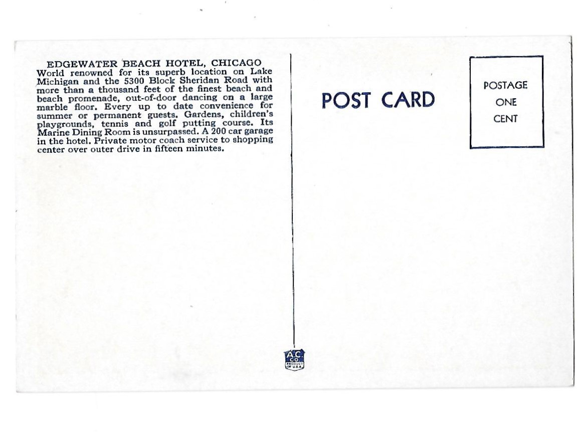 Edgewater Beach Hotel and Recreation Grounds, Chicago, Illinois. Located on Lake Michigan. Tennis, putting golf, beach promenade and 200 car garage. Stamp box is one cent.Seller Information