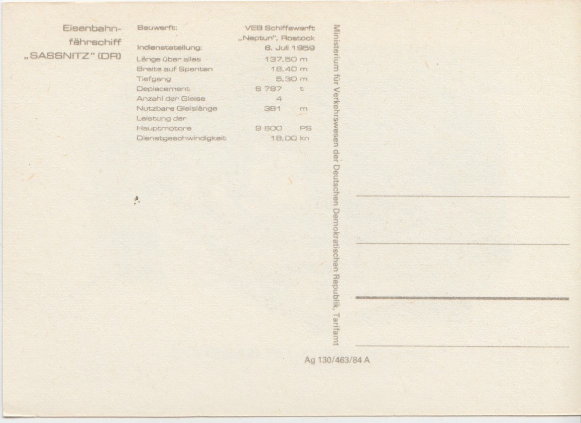 19948 Eisenbahnfahrschiff SASSNITZ, unused Postcard Condition: very good.