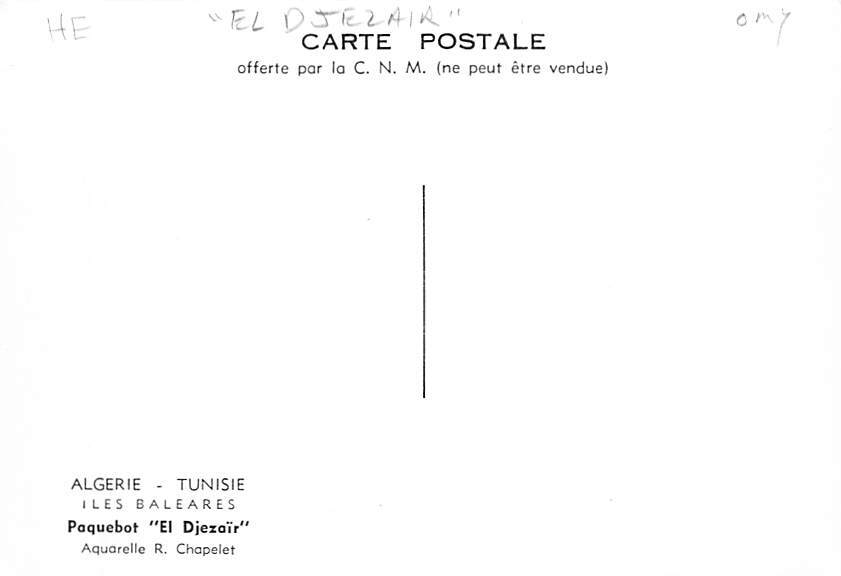 El Djezaia Ship Postcard Postal Date: {{Product Field 4 ( Postal Used, Unused)}} Grade: 1 Size: Continental Size - approximately 4 inch x 6 inch or 10 CM x 15 CM Grading Scale: Grade 1 = Perfect corners Grad ... Read More