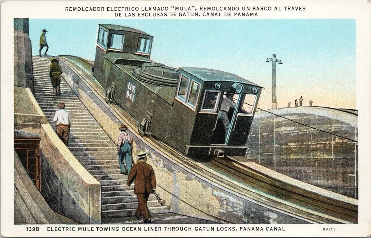 Electric Mule Towing Ocean Liner Through Gate Locks Panama Canal Postcard E45