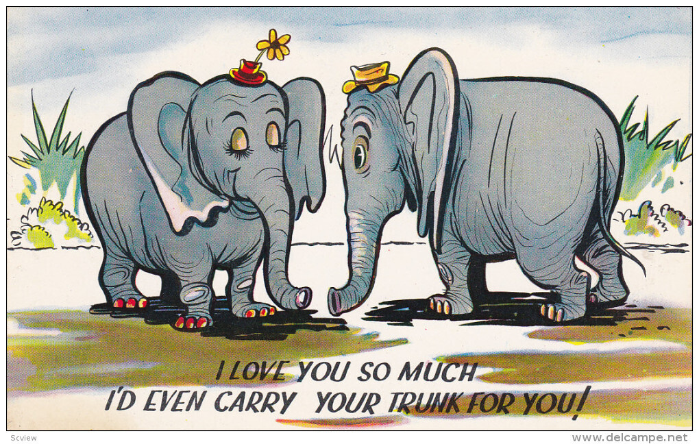 Elephant Couple Comic , "I'd carry your trunk for you!" , 50-60s :: Postcard ,3.5 by 5.5 , Chrome , EX